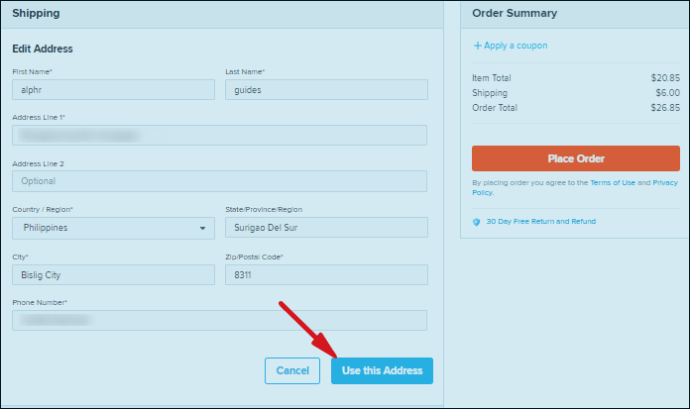 - Enfin, vous devez sélectionner le bouton bleu indiquant «Utiliser cette adresse» au bas du formulaire d’information sur l’adresse.