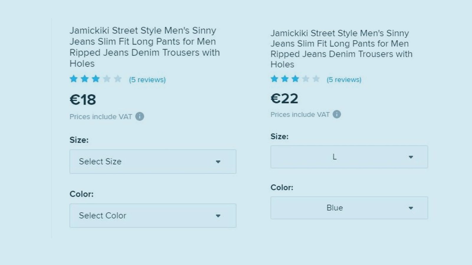 Sur l’image, nous trouvons un pantalon dont le prix est censé être de 18 €, mais qui, une fois la couleur et la taille choisies, passe à 22 €, des choix qui doivent être faits pour passer la commande.