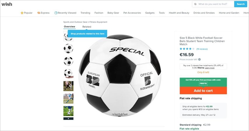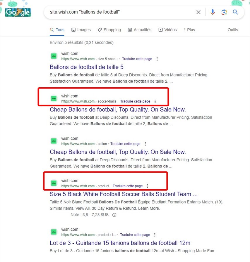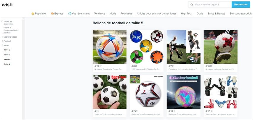 Un lien «recherche», qui sera le lien vers la page de recherche du site web Wish, nous permettra de visualiser une grande variété de produits liés au mot choisi (dans ce cas, «ballons de football»).